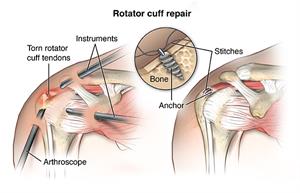 If your rotator cuff is injured, it may need surgery to repair it. This may include shaving off bone spurs that are pinching the shoulder or repairing torn tendons or muscles in the shoulder. This usually involves reattaching the tendon to the head of the humerus. Surgical techniques that may be used to repair a tear of the rotator cuff include arthroscopy, open surgery, or a combination of both. The goal of rotator cuff repair surgery is to help restore the function and flexibility of the shoulder and to relieve the pain that can’t be controlled by other treatments.