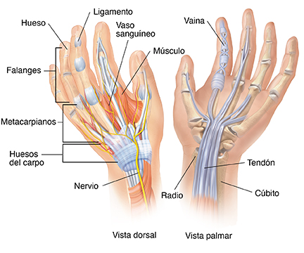 Además, dentro de la mano hay arterias, venas y nervios que suministran el flujo sanguíneo y la sensibilidad en los dedos y en toda la mano.